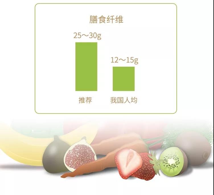 中國營養(yǎng)學(xué)會(huì)推薦 每日膳食纖維攝入量為25-30克。調(diào)查顯示,我國居民每日膳食纖維攝入量平均僅為12-15克,攝入量嚴(yán)重不足!