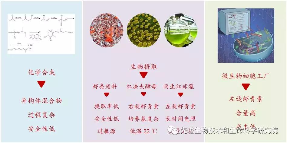 另外一種天然蝦青素的獲取方法為生物提取。(1)從蝦殼廢棄物中提取。一些動(dòng)物如魚蝦通過攝食,可以在體內(nèi)積累蝦青素。因此蝦殼廢料是天然蝦青素的一個(gè)重要來源。但蝦殼廢棄物成分復(fù)雜,蝦青素的含量相對(duì)低,目前很難大規(guī)模地從水產(chǎn)品廢棄物中提取蝦青素。此外,對(duì)海鮮過敏的人群服用此類蝦青素還可能會(huì)由于過敏源的問題導(dǎo)致過敏現(xiàn)象。(2)從紅法夫酵母中提取。紅法夫酵母作為生物安全菌株可直接作為飼料添加劑使用。但是天然的紅法夫酵母中蝦青素含量?jī)H為0.2-0.4 mg/g DCW,并且所產(chǎn)的蝦青素100%為右旋(3R-3′R)產(chǎn)物,抗氧化活性不如左旋蝦青素。此外,利用紅法夫酵母生產(chǎn)蝦青素的技術(shù)要求高,發(fā)酵培養(yǎng)基成分豐富,且在發(fā)酵過程中要求保持低溫(22 ℃)。(3)從雨生紅球藻中提取。雨生紅球藻是目前天然蝦青素含量最高的生物,蝦青素含量達(dá)到15-30 mg/g DCW,而且雨生紅球藻中的蝦青素以左旋(3S-3′S)形式存在,生物學(xué)活性很高。但是雨生紅球藻自養(yǎng)周期長(zhǎng),在培養(yǎng)過程中需要長(zhǎng)時(shí)間的光照以及大量的淡水,同時(shí)下游分離難度大,藻類很難破壁釋放蝦青素,極大的限制了利用雨生紅球藻進(jìn)行大規(guī)模工業(yè)化生產(chǎn)天然蝦青素的應(yīng)用。